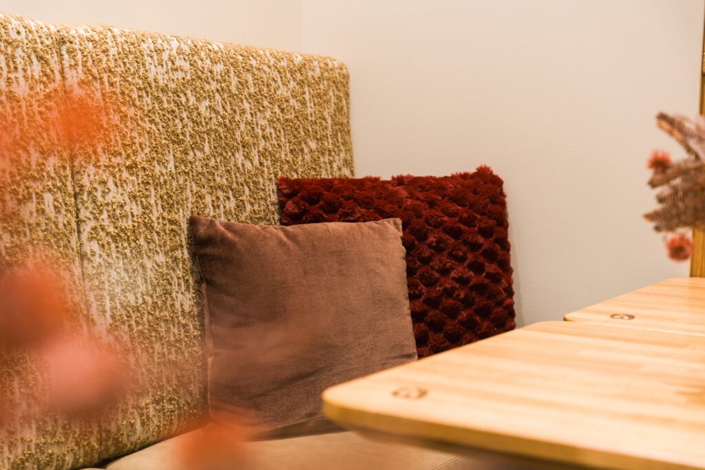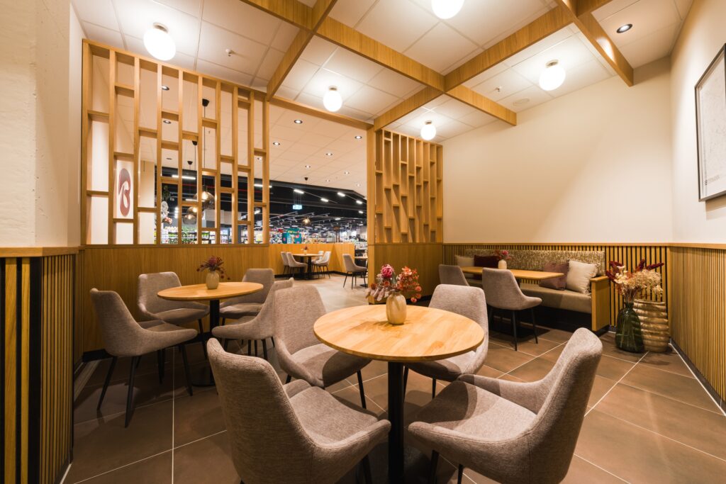 - Rückzug mitten im Einkaufstrubel bietet der gemütliche Sitzbereich: mit weichen Stoffen & Bouclé, gemütlichen Nischen gerahmt von raumhohen Eiche-Regalen und abgehängten Holzgefachen.
