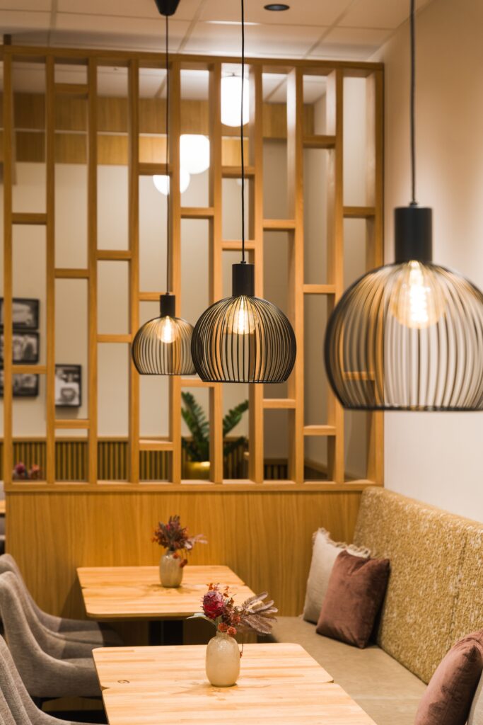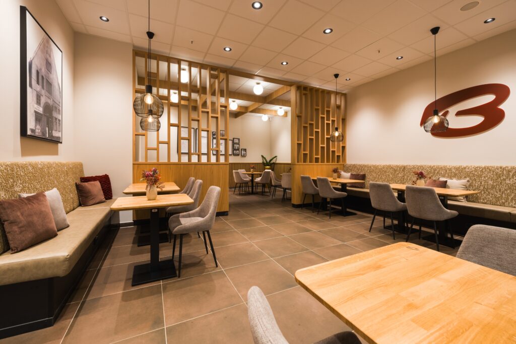 - Die knapp 12 Meter lange Theke mit ruhiger Steinoptik & warmen Eiche-Lamellen ist ein gestalterisches Highlight – und perfekt auf schnelle Abläufe ausgelegt.